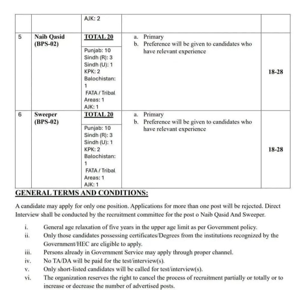| Naib Qasid (BPS-02) | Primary | • Preference given to candidates with relevant experience | 18–28 Years |